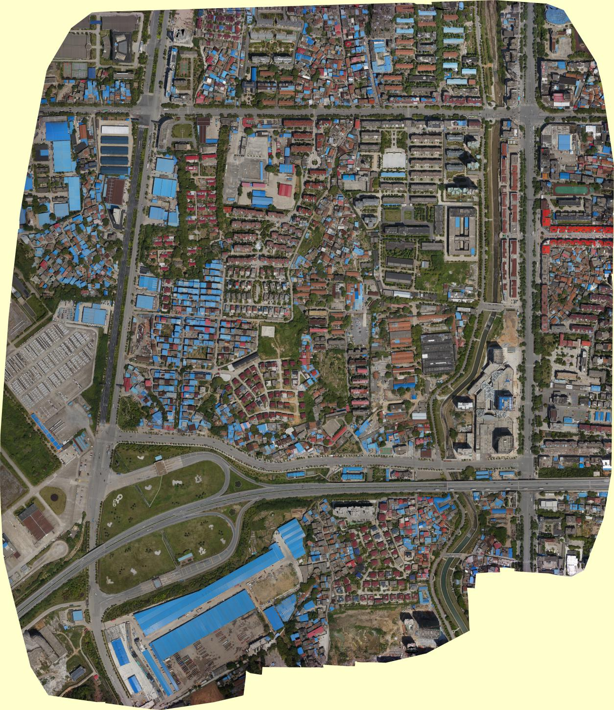 棚改项目(城市之门、九柴花园畈)为了改善群众的居住条件,兼顾完善城市功能、改善城市环境的目的。我市在2017、2018年度开展了大规模的棚户区改造工程,共涉及浔阳区、濂溪区、八里湖新区、开发区等80余宗地,总共预计改造户数高达十万余户。我队受九江市棚改办公室的委托,承担了全部棚户区改造的地形图测绘和面积初步统计工作。项目要求在段时间内获取大范围的地形图数据,并初步确定房屋的层数、结构和面积,为了完成任务要求,并增加项目的直观可视性,我队采用了新型的测绘技术,利用无人机倾斜摄影获取高精度和高清晰度的正射影像图。图为我队获取的九柴及花园畈、城市之门片区的数字正射影像图,该图具有直观逼真、获取快捷等优点,可作为地图分析地块现状,也可从中提取自然资源和社会经济发展的历史信息或最新信息,为项目的展开提供了依据。我队利用此项技术,并结合传统现场调查测绘,在短时间内完成了大批次的棚改初期准备工作,顺利推进了旧城区改造的进度,获得了市领导办公室的高度认可。
