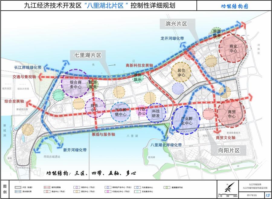 “五轴”——指沿九瑞大道形成的“综合发展轴”、沿滨江西大道形成的“交通与景观轴线”、沿长江大道形成的“商贸文化轴”、沿泰山路形成的“产业发展轴”及沿抗洪大道形成的“景观与服务轴”。